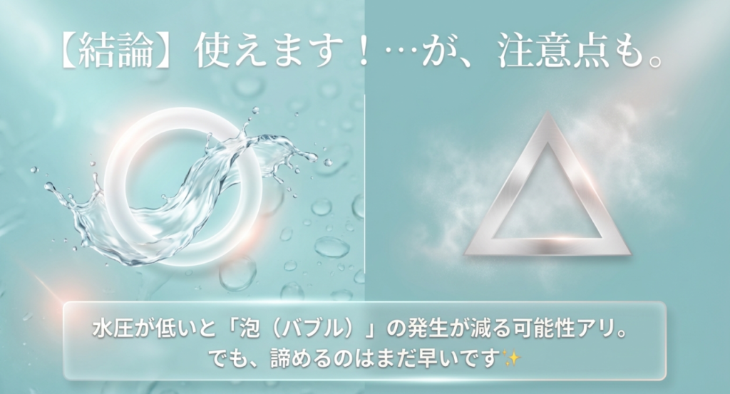 水圧が著しく低い環境では、ファインバブルの生成量が減り、本来の洗浄力が発揮されにくくなります。一方で、「水圧が弱い=全く使えない」というわけではなく、肌あたりの柔らかさを求めている方や、赤ちゃんや肌が敏感なお子様と一緒に使う場面では、柔らかい水流をむしろメリットと感じる声もあります。
