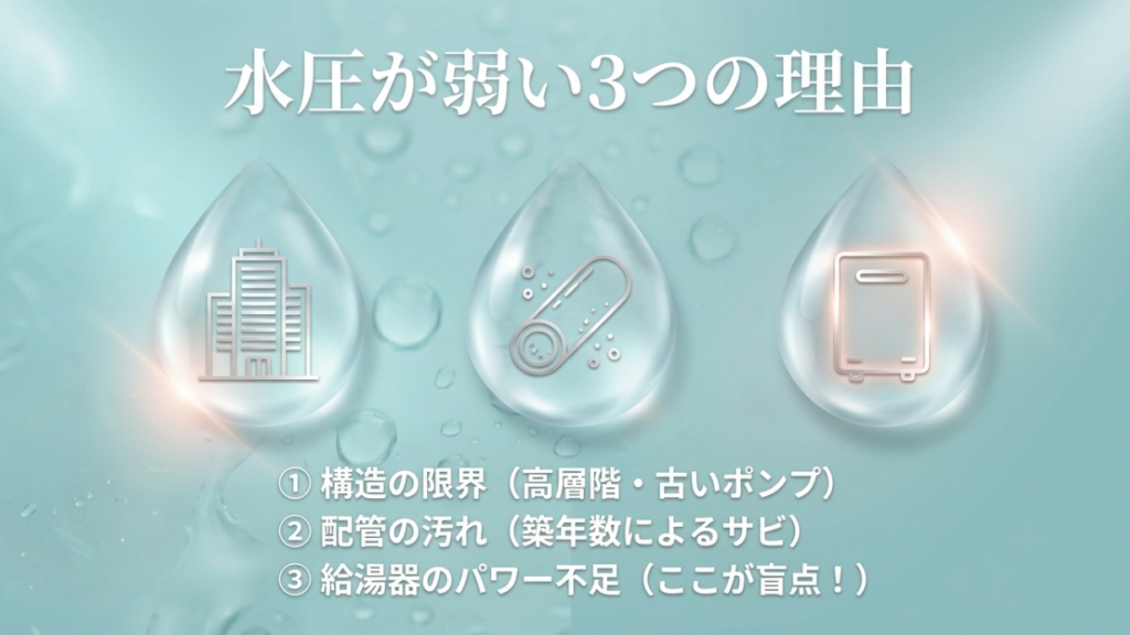 賃貸マンションでシャワーの水圧が弱い場合、大きく分けて3つの原因が考えられます。それぞれ対処法が異なるので、まず自分の状況がどれに近いかを確認することが大切です。