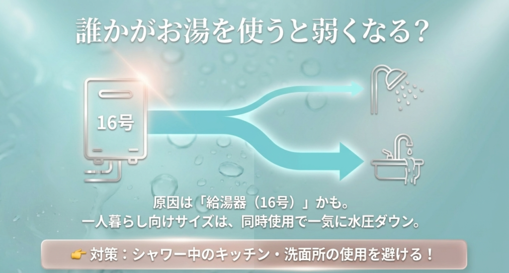 賃貸物件に設置されている給湯器が16号の場合、シャワー中にキッチンでお湯を使うだけで一気に水圧が落ちます。「誰かがキッチンを使うとシャワーが細くなる」という現象はこれが原因です。残念ながら、賃貸では給湯器を勝手に交換することは契約上できないため、大家や管理会社への相談が必要になります。