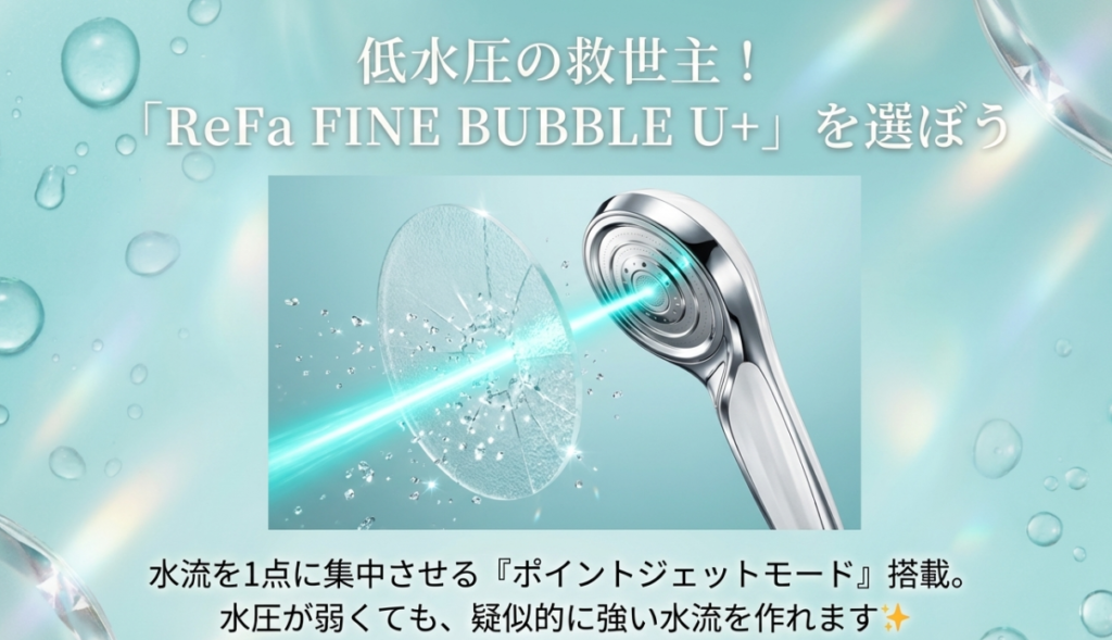 - ✅ ReFa FINE BUBBLE U+のポイントジェットモードは、低水圧環境でも強い水流感を生み出せる