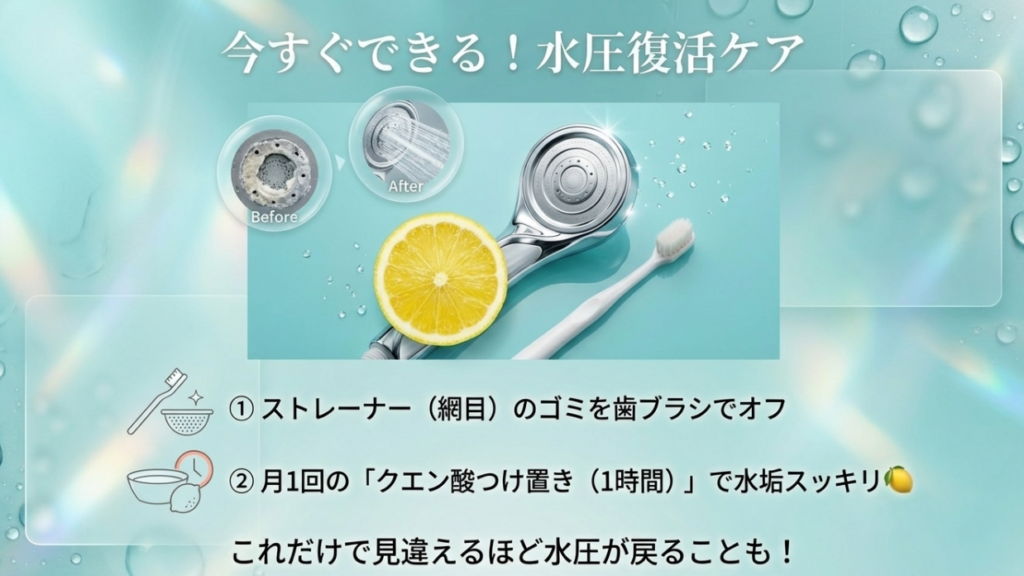- ✅ クエン酸洗浄・ストレーナー清掃の月1習慣で水圧を安定させられる